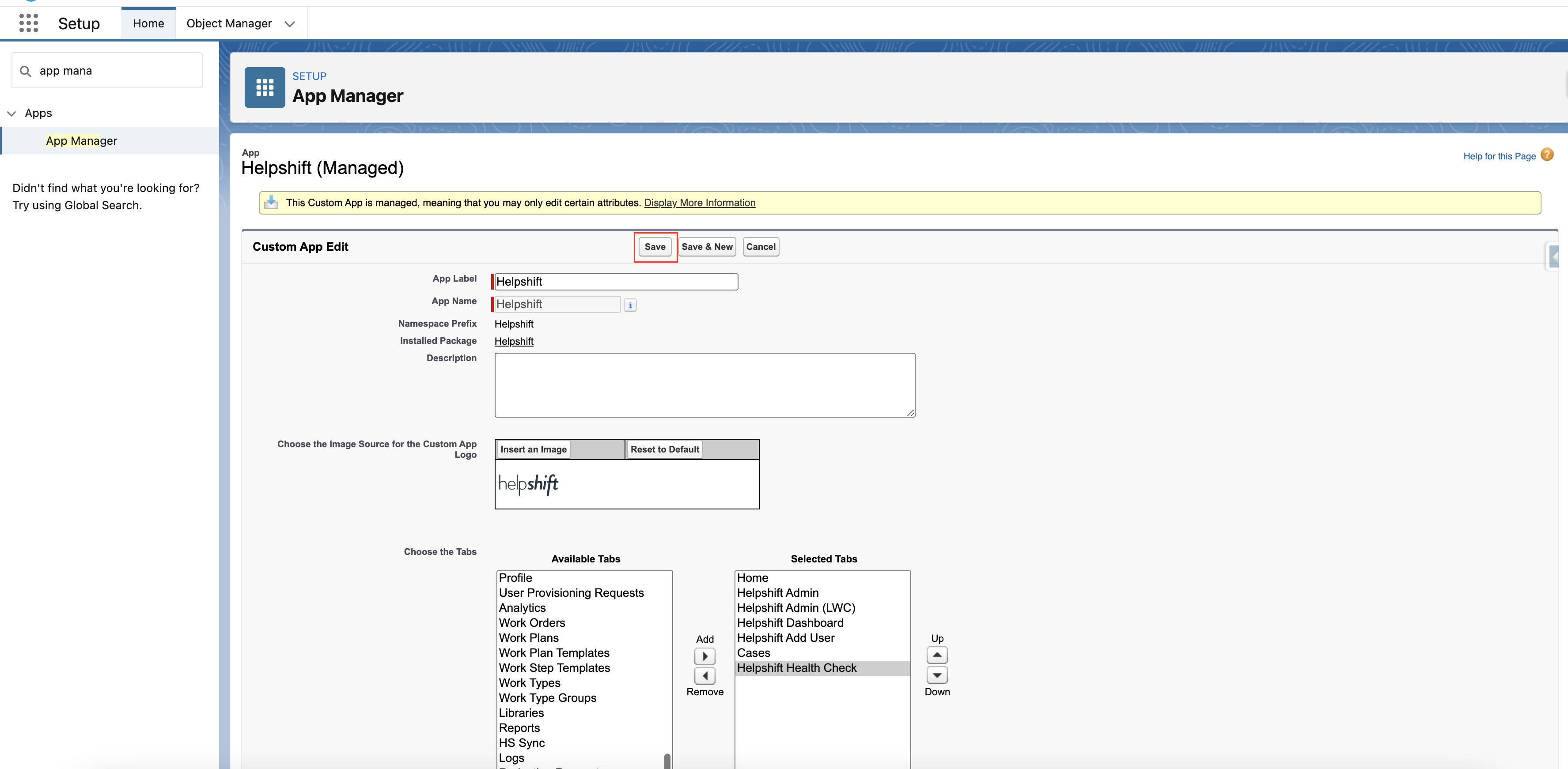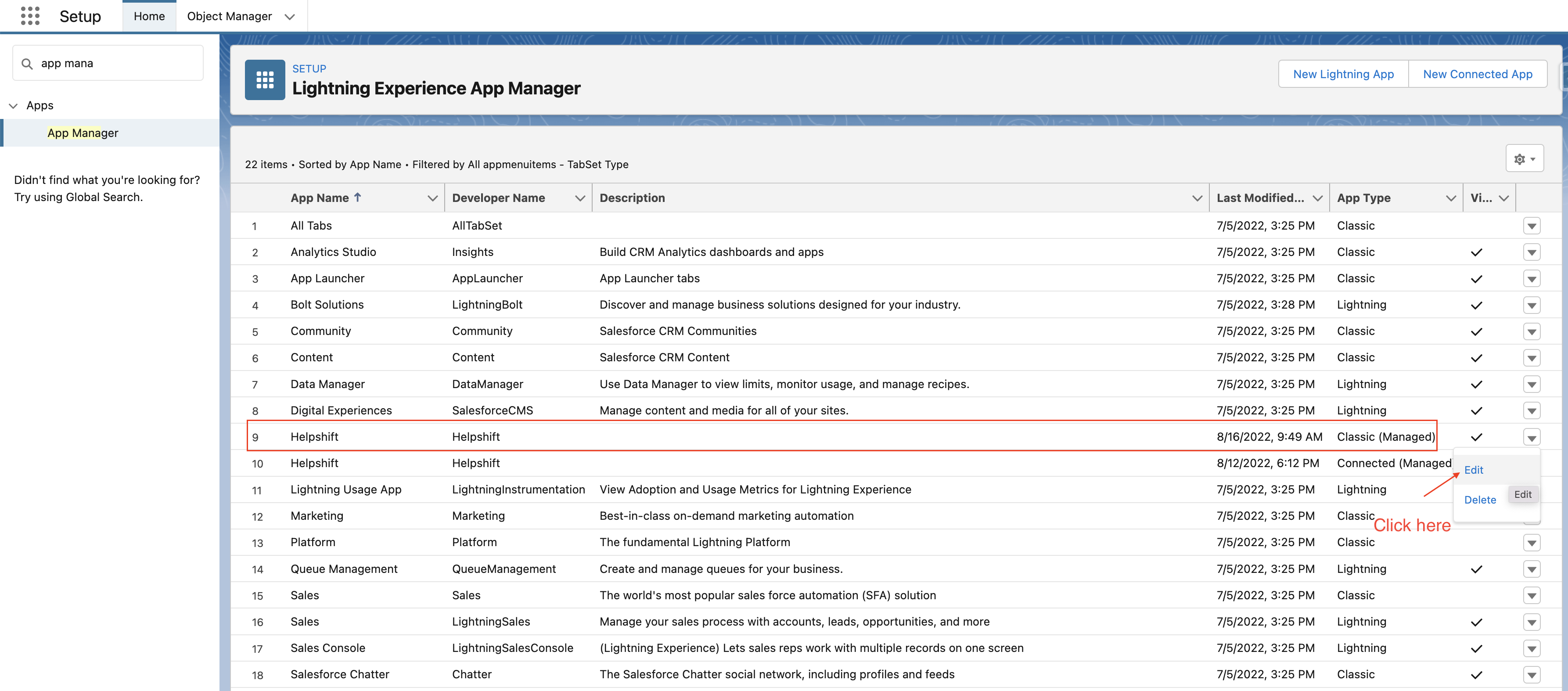 - Navigate to Setup and search for App Manager.